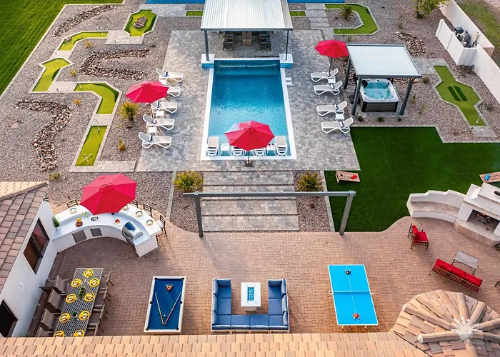 The 6-bedroom The Epic Resort An Acre Of Fun For Everyone Chandler villa offers proximity to nearby tourist spots, such as Zelma Basha Salmeri Gallery, situated 2.4 miles away. Guests can enjoy cycling at this 6-bathroom villa, located around 10 minutes' drive from Tumbleweed Park.